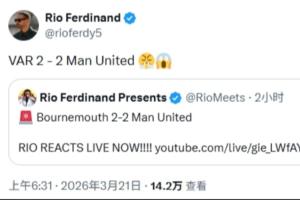 体育资讯03月21日讯 英超第31轮,10人曼联客场2-2战平伯恩茅斯,本场比赛的判罚引发争议。赛后,费迪南德愤怒发文:“VAR 2-2 曼联😤😱”。